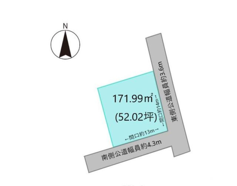 角地 東 間口14m 公道 幅3.6m 南 間口13m 公道 幅4.3m |
